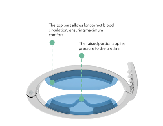 The raised portion on the bottom part of the clamp applies pressure to the urethra, controlling the flow of urine, while the top part of the clamp is designed to release pressure, allowing correct blood circulation and ensuring maximum comfort.